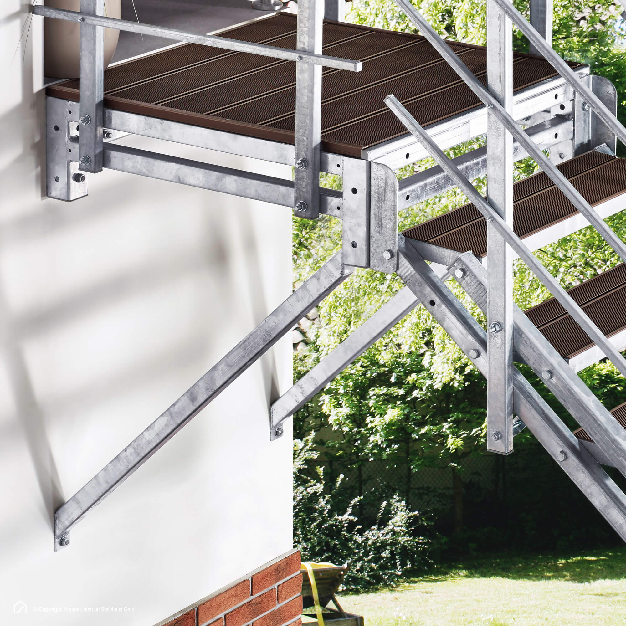 - Das Podest der Außentreppe Hollywood ist standardmäßig mit zwei Schrägstützen ausgestattet, die das Podest diagonal zur Wand hin abstützen. Wenn sich allerdings beispielsweise ein Fenster unterhalb des Podestes befindet, müssen die diagonalen Wandstützen durch zwei Bodenstützen ersetzt werden.