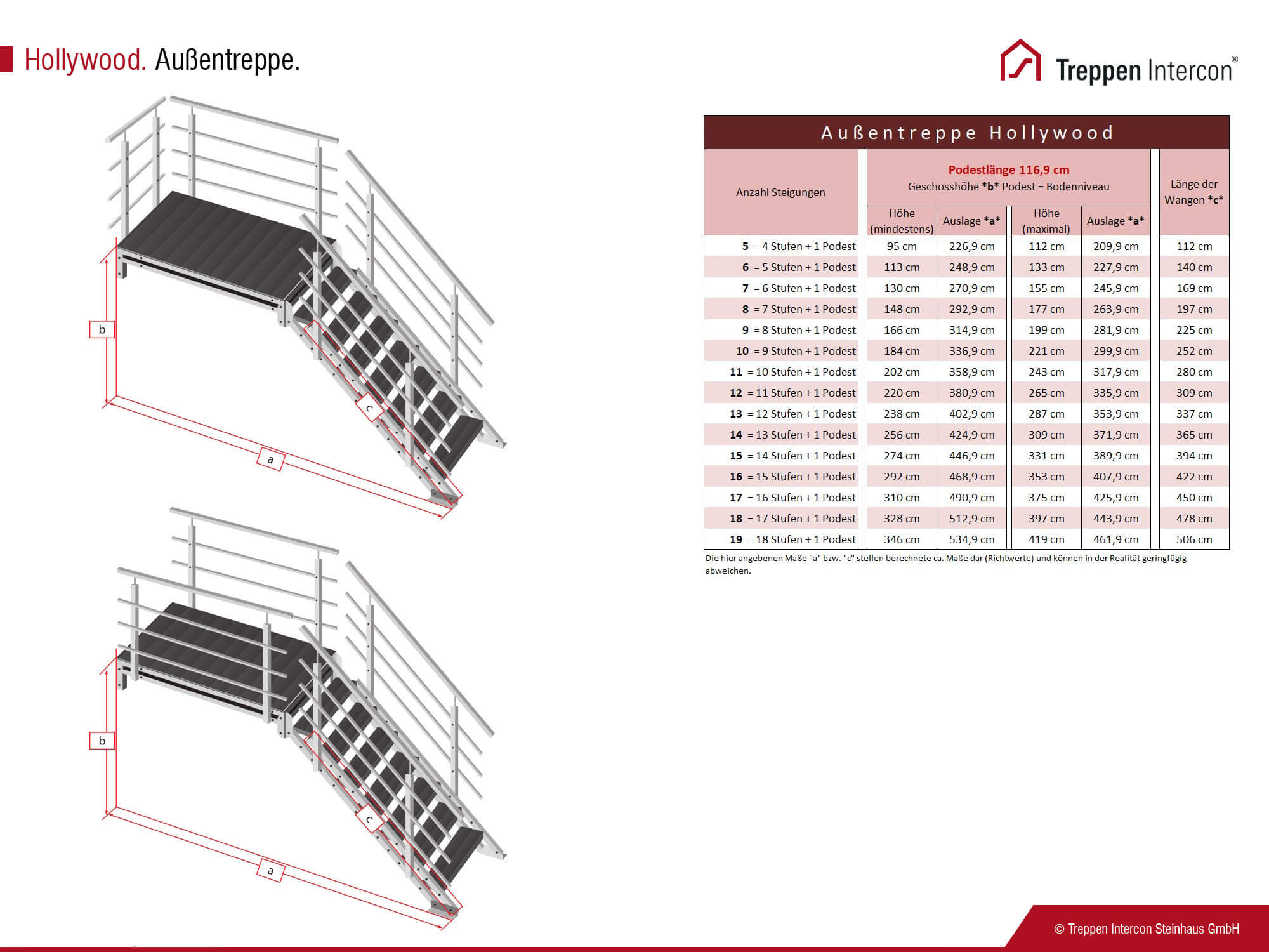 - Mit der Außentreppe Hollywood mit Podest überbrücken sie je nach Stufenzahl Geschosshöhen von 95 bis 419 cm.