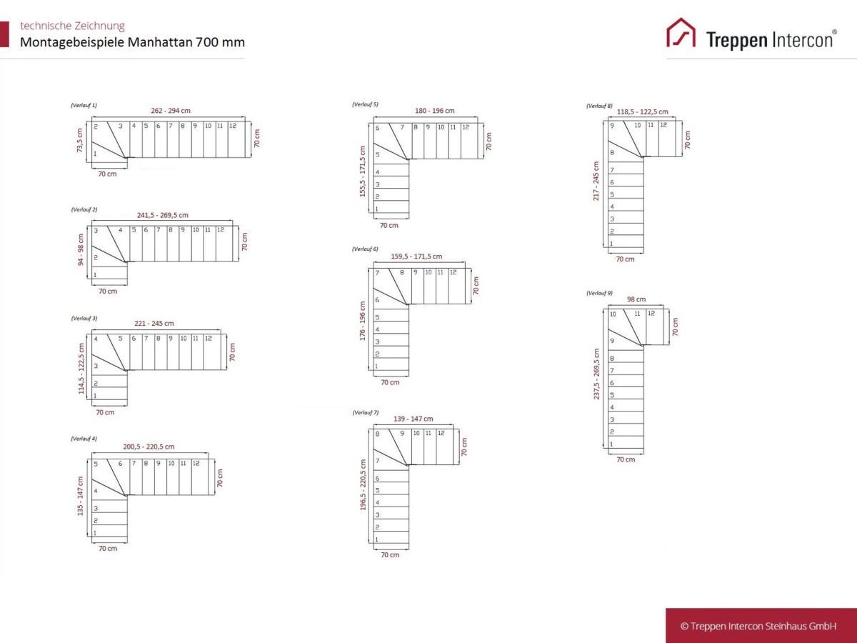 Die Mittelholmtreppe Manhattan verfügt über eine Viertelwendelung aus drei Eckstufen, die Sie nahezu beliebig im Verlauf platzieren können. In der oberen Bildergalerie finden Sie einige Montagebeispiele. Bitte beachten Sie, dass die Breite der Deckenöffnung von der gewählten Stufenbreite abhängt. Die Gesamtbreite der Mittelholmtreppe beträgt 75, 85 bzw. 95 cm inklusive Geländer. Dementsprechend liegt die benötigte Deckenöffnung bei 200 x 75 cm, 200 x 85 cm bzw. 200 x 95 cm.