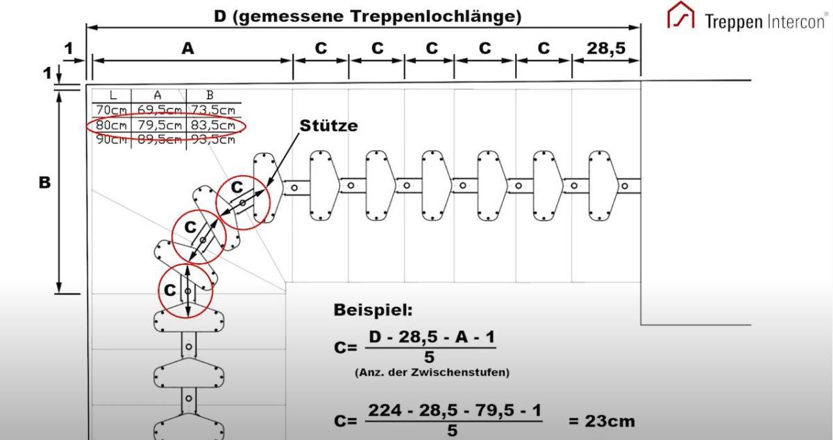 Berechnen Sie die erforderliche Auftrittstiefe der Zwischenstufen wie im nachfolgenden Beispiel. Klicken Sie hierfür einfach auf das Bild.