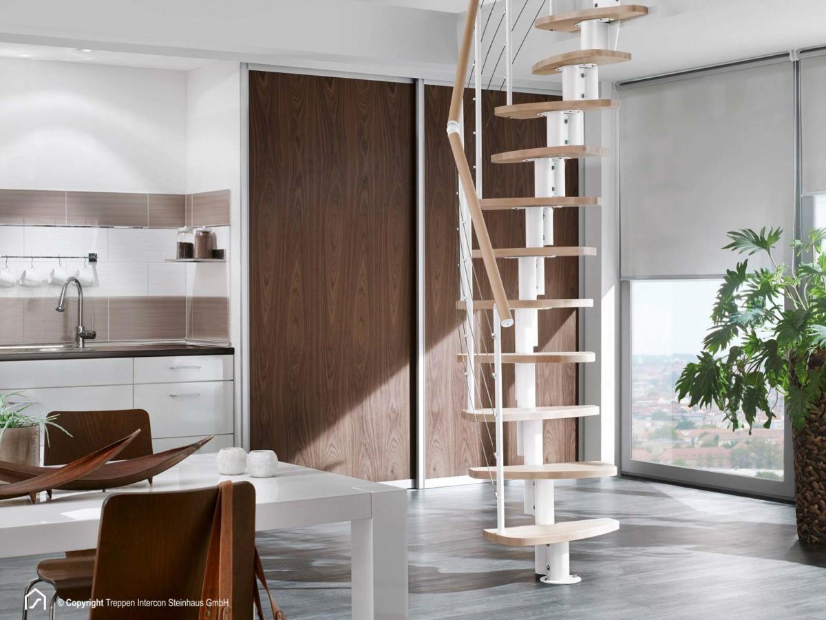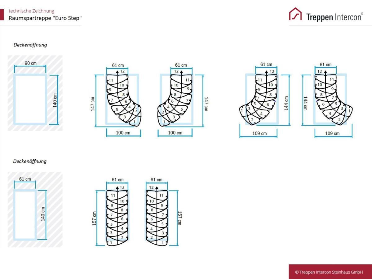 Sie können die Raumspartreppe Intercon Euro Step wahlweise gerade oder gewendelt montieren, ganz wie es zu Ihren Räumlichkeiten passt. In unserer Bildergalerie finden Sie einige Beispiele für mögliche Aufbauten. Bitte beachten Sie, dass die Mindestgröße der Deckenöffnung vom gewünschten Treppenverlauf abhängig ist. Die Raumspartreppe ist für Deckenöffnungen ab 140 x 61 cm geeignet.