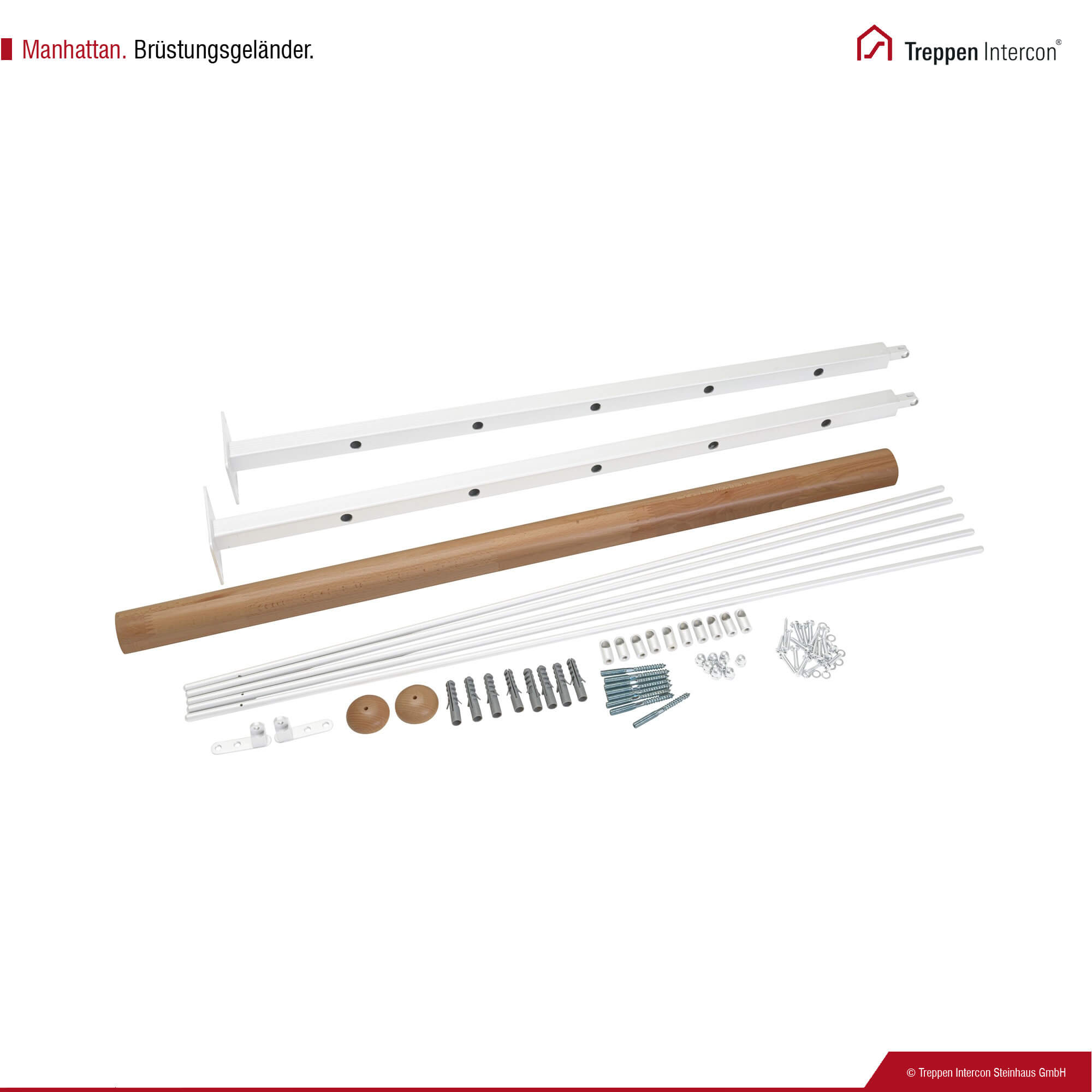 Passend zur Mittelholmtreppe Manhattan gibt es ebenfalls ein Brüstungsgeländer zu kaufen, denn die offenen Seiten einer Deckenöffnung müssen abgesichert werden. Das Geländer besteht je Set aus einem 100 cm langen Bausatz, welches in der Länge bauseits angepasst werden kann.