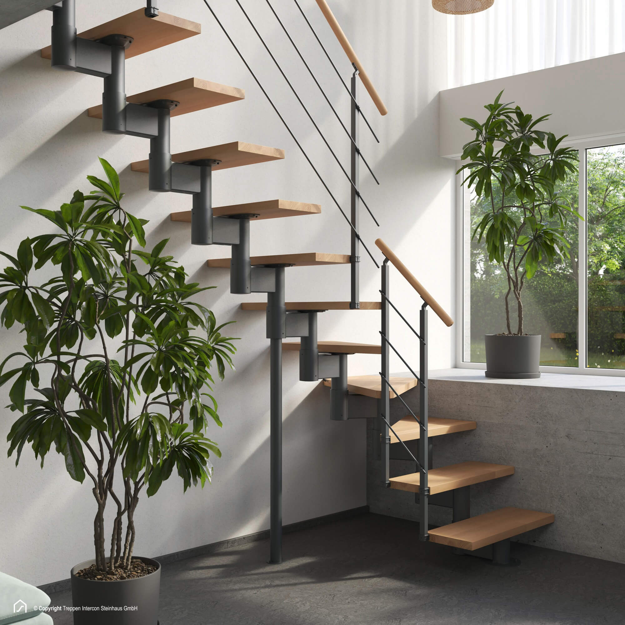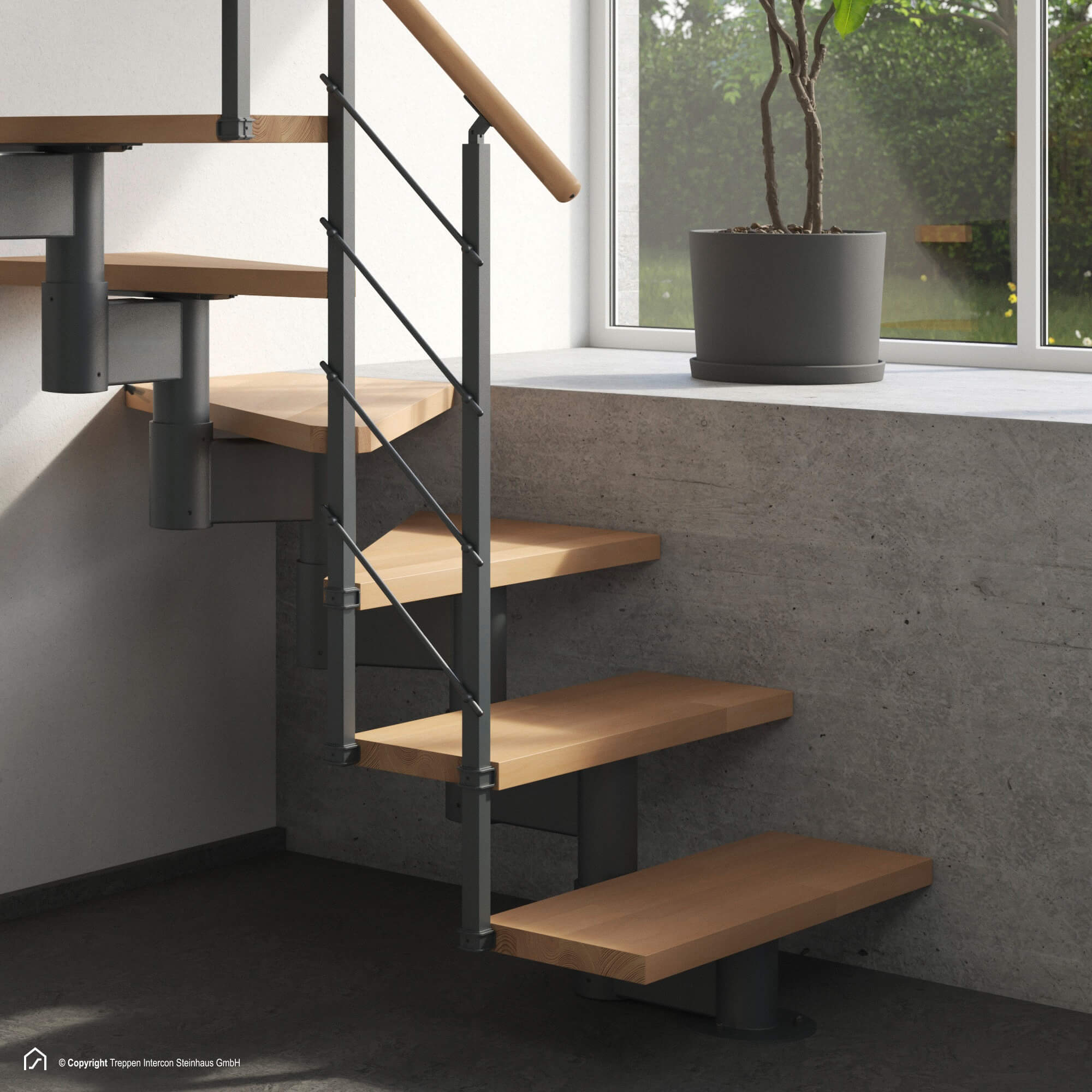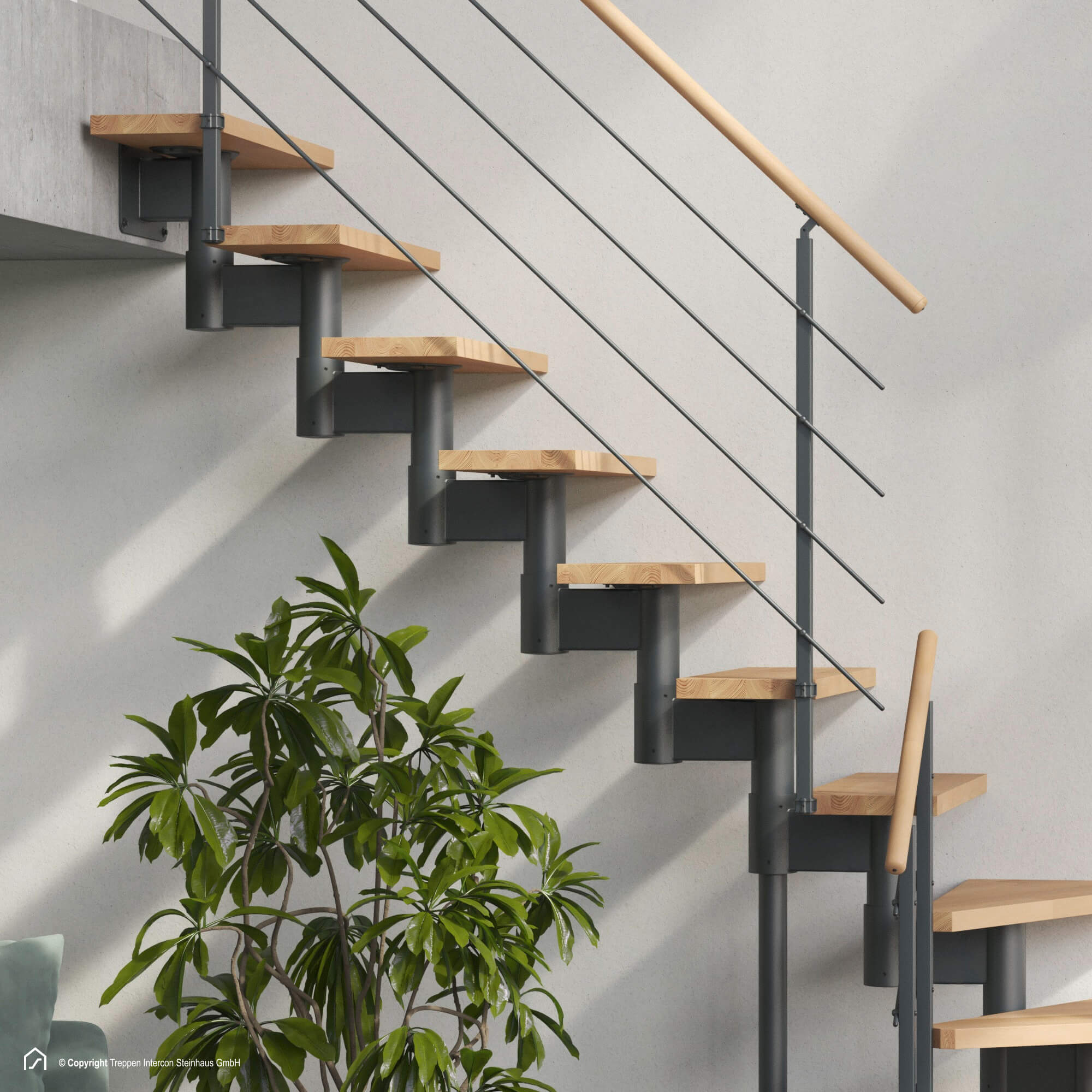 In unserem Shop finden Sie die Mittelholmtreppe Intercon Manhattan in vielen verschiedenen Varianten. Sie haben die Wahl zwischen Stufenbreiten von 80 oder 90 cm, den Metallfarben Italo-Silber, Polar-Weiß & Lava-Anthrazit sowie den Stufendesigns in Buche natur, Buche dunkel und Eiche natur. Zu guter Letzt können Sie sich noch zwischen einer Viertelwendelung nach links oder rechts entscheiden. Sie sehen, Ihnen stehen viele Möglichkeiten zur Anpassung der Mittelholmtreppe offen.