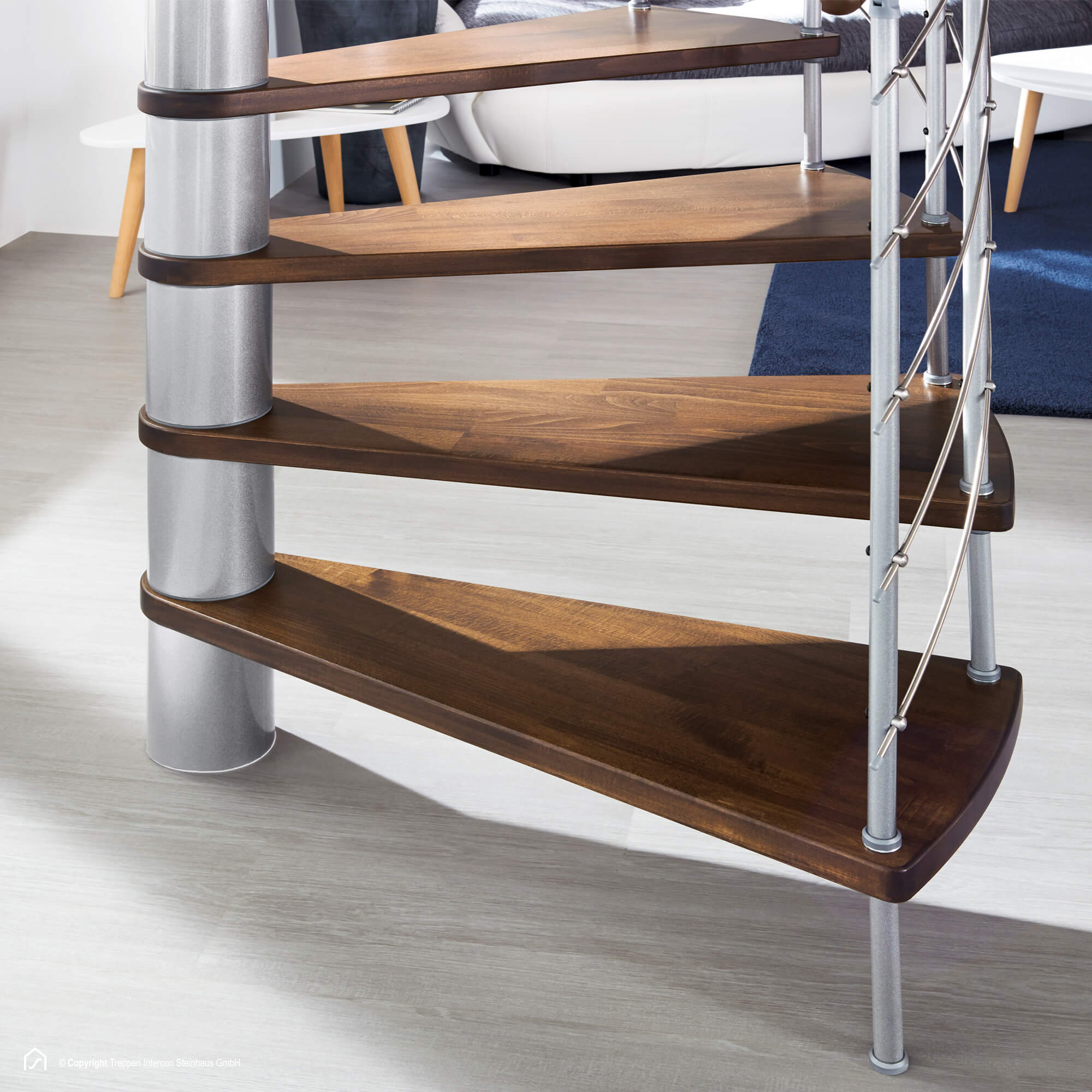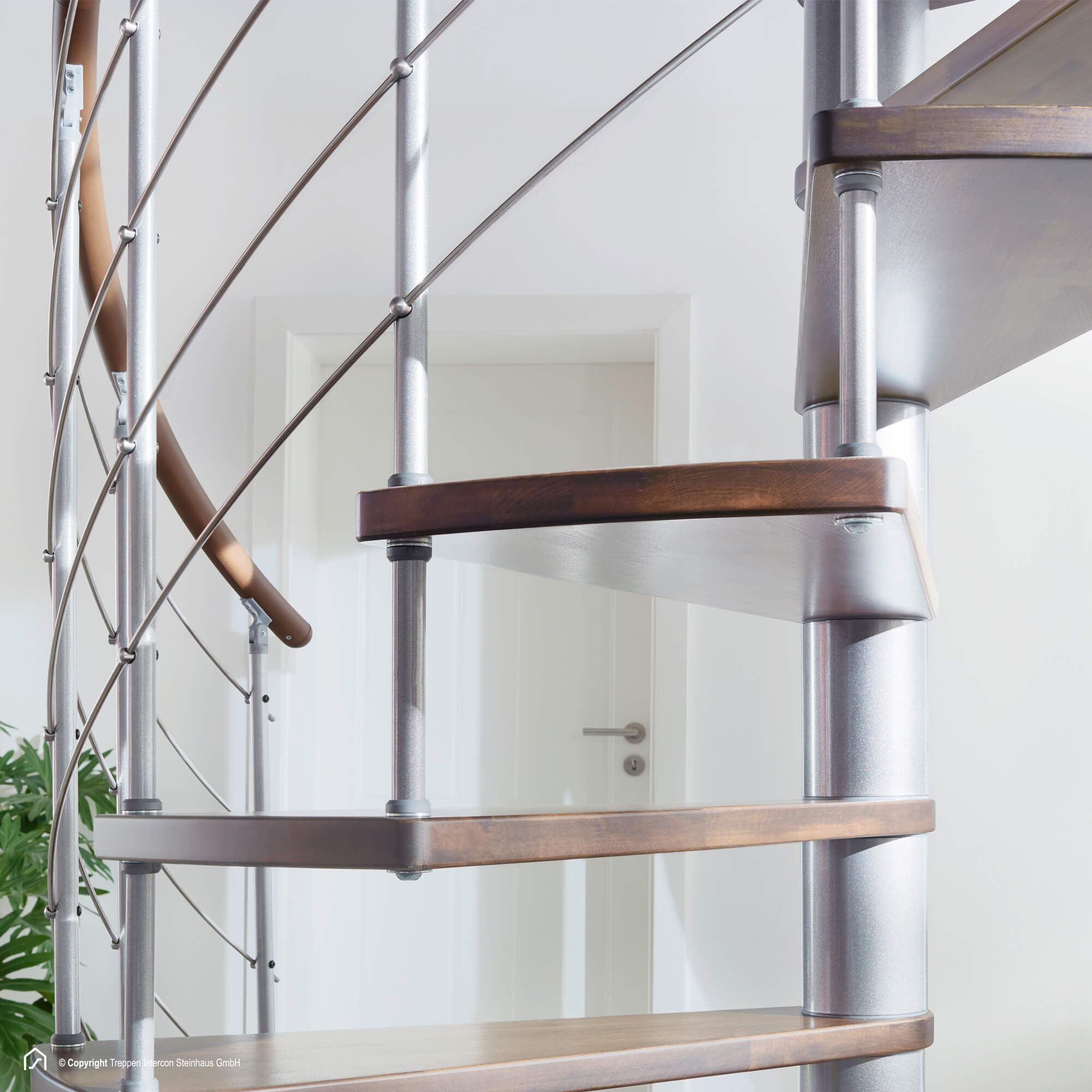 - Die Stufen der Spindeltreppe bestehen aus robustem Massivholz Buche oder Eiche mit einer Stärke von 35 mm.
