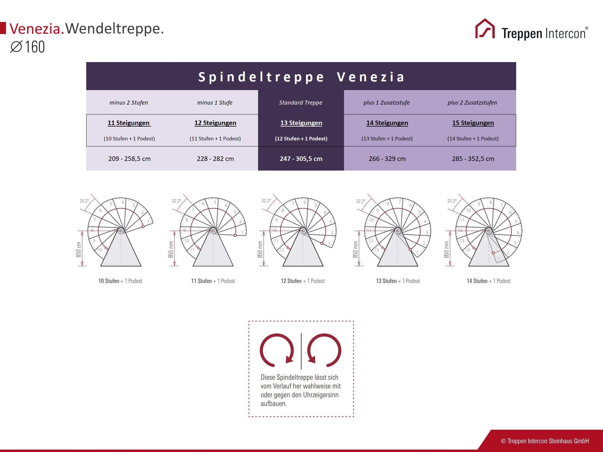 - Mit der Spindeltreppe Venezia erreichen Sie je nach Stufenzahl Geschosshöhen von 247 bis 352,5 cm.